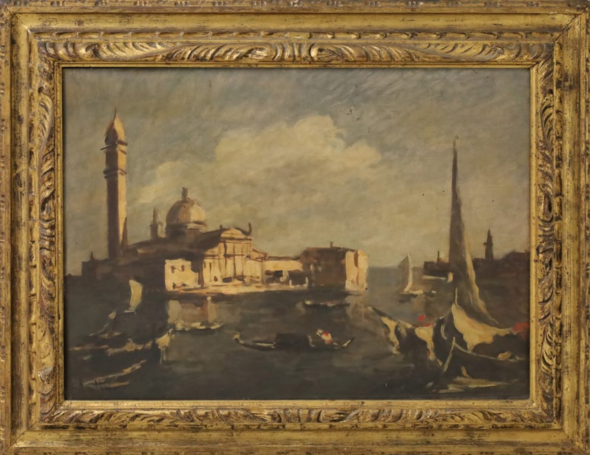 Firma in basso a sinistra L'artista si dedicò con passione alla pittura prospettica, ritraendo con notevole attitudine e rapidi tocchi vedute urbane della sua amata Milano e non solo, come si evince da questo scorcio di Venezia, attraverso quella che appare una rivisitazione in chiave impressionista della tradizione della pittura lombarda.