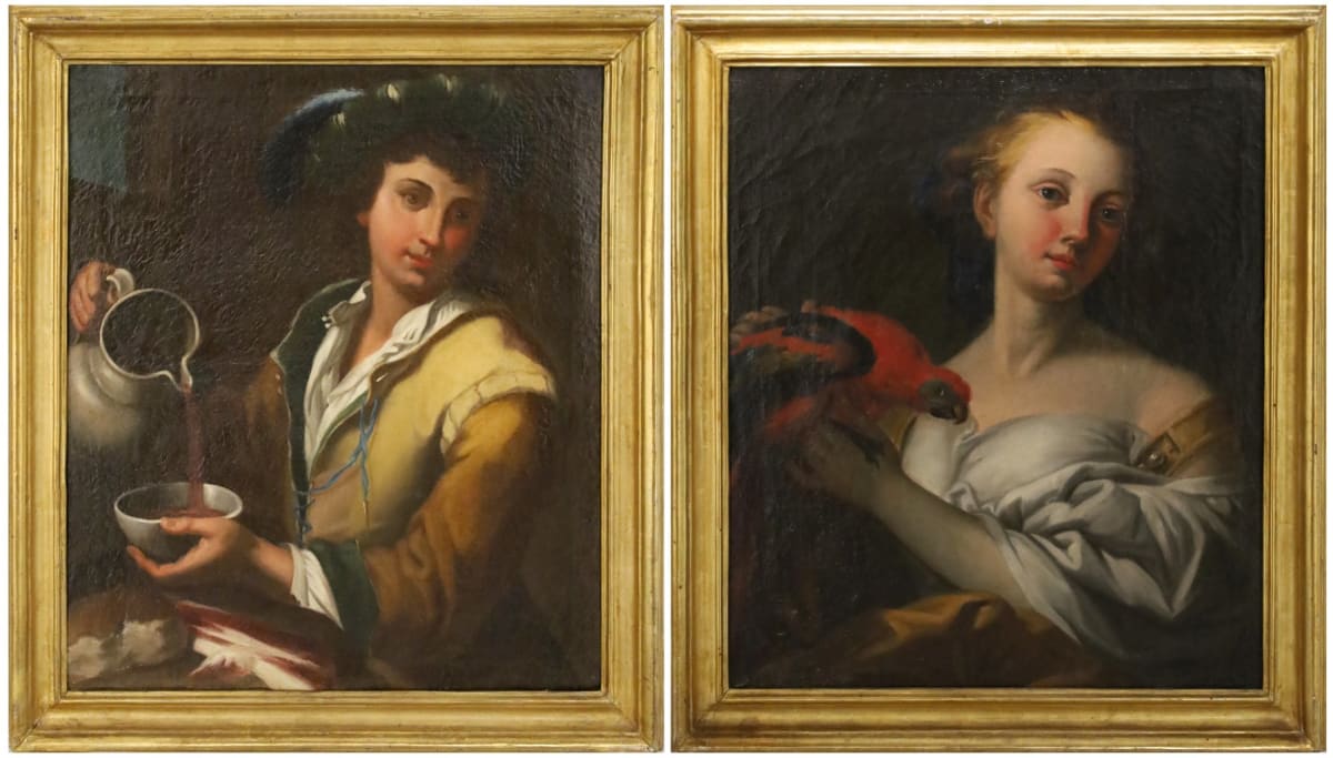 Questa bella coppia di figure costituiscono una rilevante acquisizione al catalogo di Antonio Mercurio Amorosi, Comunanza (AP) 1660 - Roma 1738, alleghiamo scheda del prof. Giancarlo Sestieri. La sua formazione avvenne con il conterraneo Giuseppe Ghezzi e seguitò con il figlio di questi, Pier Leone. La fortunata carriera dell'artista è testimoniata da Lione Pascoli, suo biografo ed estimatore. Le tele ritraggono scene di genere domestiche, le pittoresche figure sono felicemente immerse in un'atmosfera dalle tematiche bamboccianti in chiave Settecentesca, secondo una visione della realtà assai simile da quella narrata nelle opere di Eberhard Keilhau detto Monsù Bernardo.