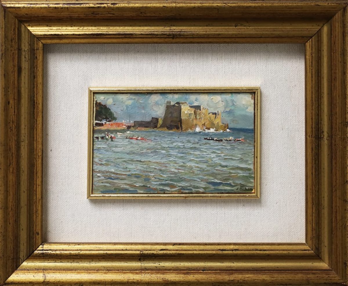 Firma in basso a destra. Bel dipinto di Attilio Pratella, raffigurante una marina napoletana con il Castel dell'Ovo. Da notare la qualità con cui l'artista dipinge il cielo e il mare, veri marchi di fabbrica di Attilio Pratella. In questo periodo Pratella risulta aggiornato e pienamente calato nel suo tempo, la pennellata si fa più sciolta, rapida, materica, ma allo stesso tempo in grado di offrire una importante visione d'insieme.