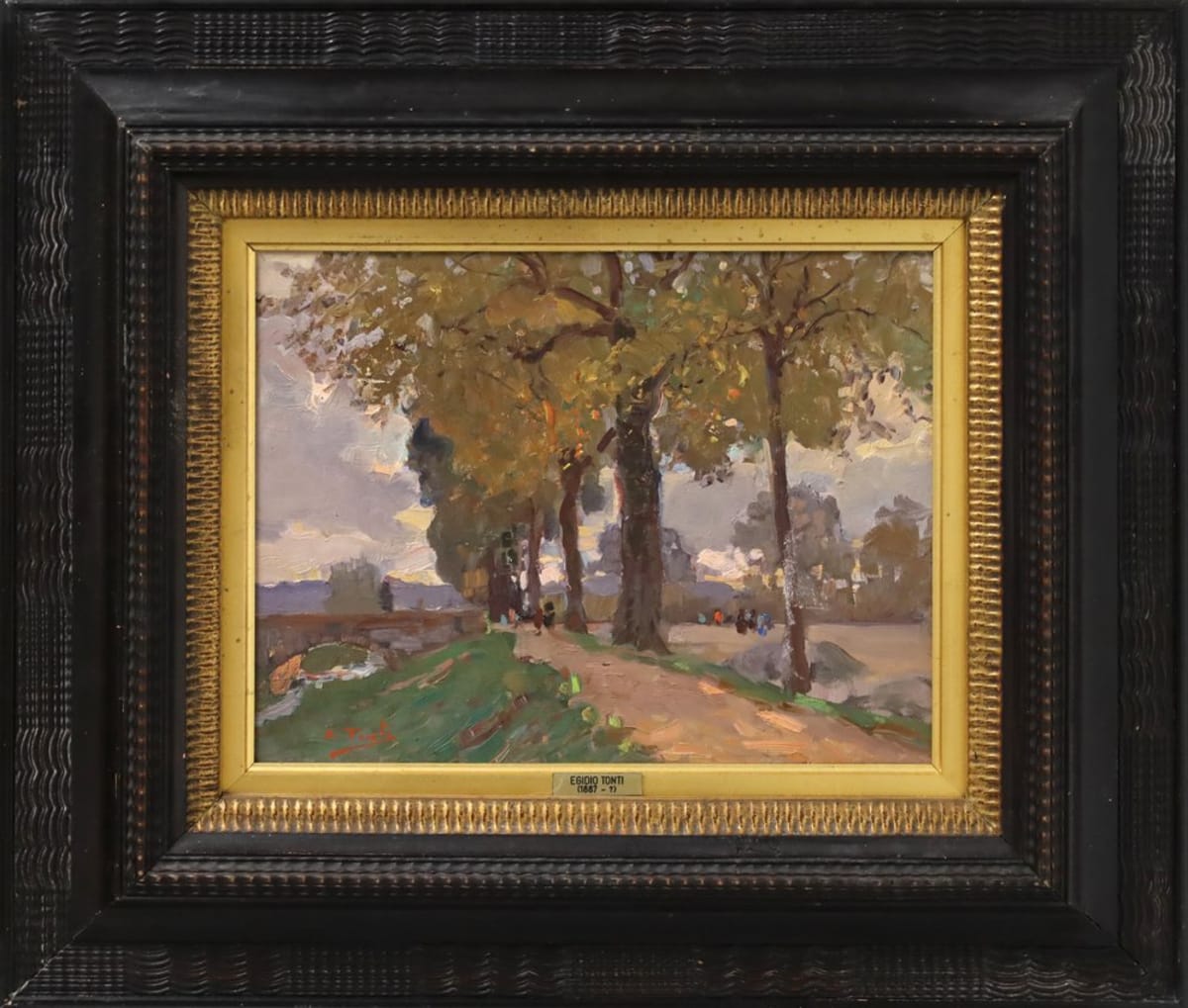 Firma in basso a sinistra; a retro timbro Galleria La Stanzina Rara opera di Egidio Tonti, pittore salentino nato a Presicce nel 1887 e trasferitosi a Napoli nel 1905, accolto dal conterraneo Giuseppe Casciaro. Nel 1907 è a Firenze, prima di emigrare, nel 1922, negli Stati Uniti. Alcune fonti lo riportano a Roma nel 1950, dove poi morì nel 1965.