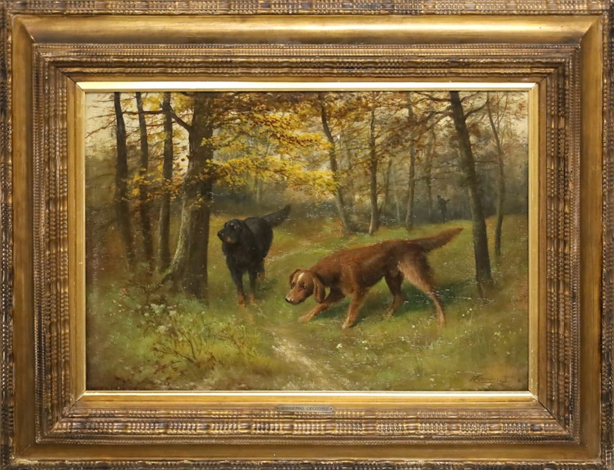 Firma in basso a destra Cecconi fu tra i principali artisti macchiaioli, già a partire dal 1866, quando si unice al gruppo attivo a Castiglioncello con Diego Martelli. Scelse il paesaggio, attento alla sintesi formale, alla sobrietà esecutiva. Più avanti si dedicherà anche a scene di caccia e a temi orientalisti, dopo il viaggio del 1875 in Tunisia con Belimbau. Splendida scena di caccia eseguita intorno al 1880/1890.