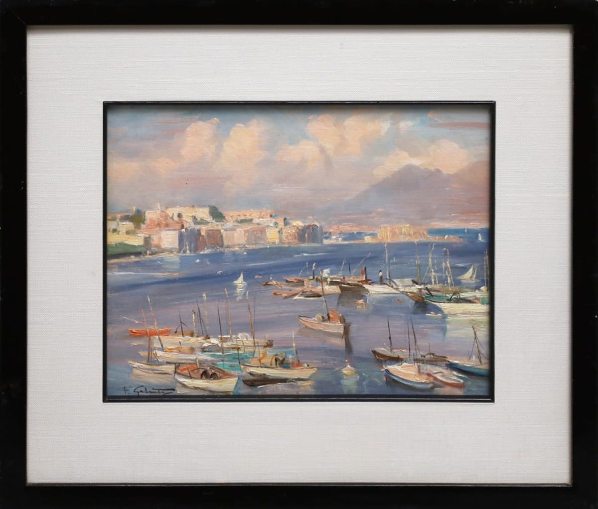 Firma in basso a sinistra Pugliese di origine, Galante si forma a Napoli prima di trasferirsi a Milano, dove entra in contatto anche con la Secessione viennese e l'ambiente dell'Art Noveau. Si caratterizzò per la raffigurazione di paesaggi e di interni soffusi e delicati, in cui l'intimismo è sottolineato da campiture compatte di colore puro. Splendida veduta di Napoli della piena maturità dell'artista.