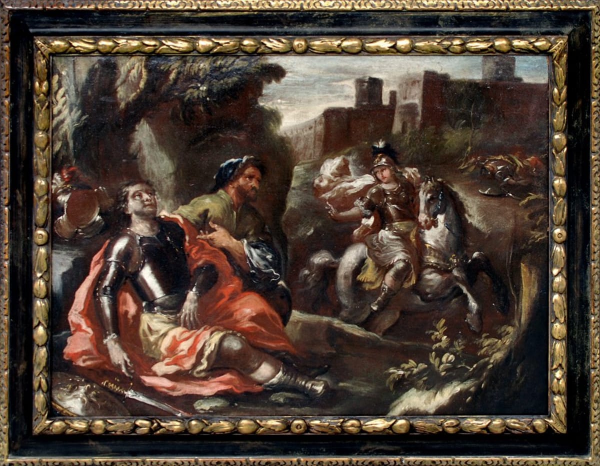 Giacomo del Po, Roma 1652 - Napoli 1726, si formò presso la bottega del padre e nel 1674 divenne membro dell’Accademia di San Luca e nel 1683 lasciò Roma per trasferirsi a Napoli. Nei primi anni a Napoli subì l’influsso dell’arte di Luca Giordano, come di evince dalla nostra tela, che fu fondamentale per la formazione del suo stile maturo. Fu considerato una personalità di spicco della pittura tardo-barocca napoletana, grazie soprattutto alla fama ottenuta con i suoi dipinti a soggetto sacro e profano. Fu apprezzato anche per i piccoli dipinti a soggetto letterario, come Il paradiso perduto, ispirato all’omonimo poema epico di John Milton.