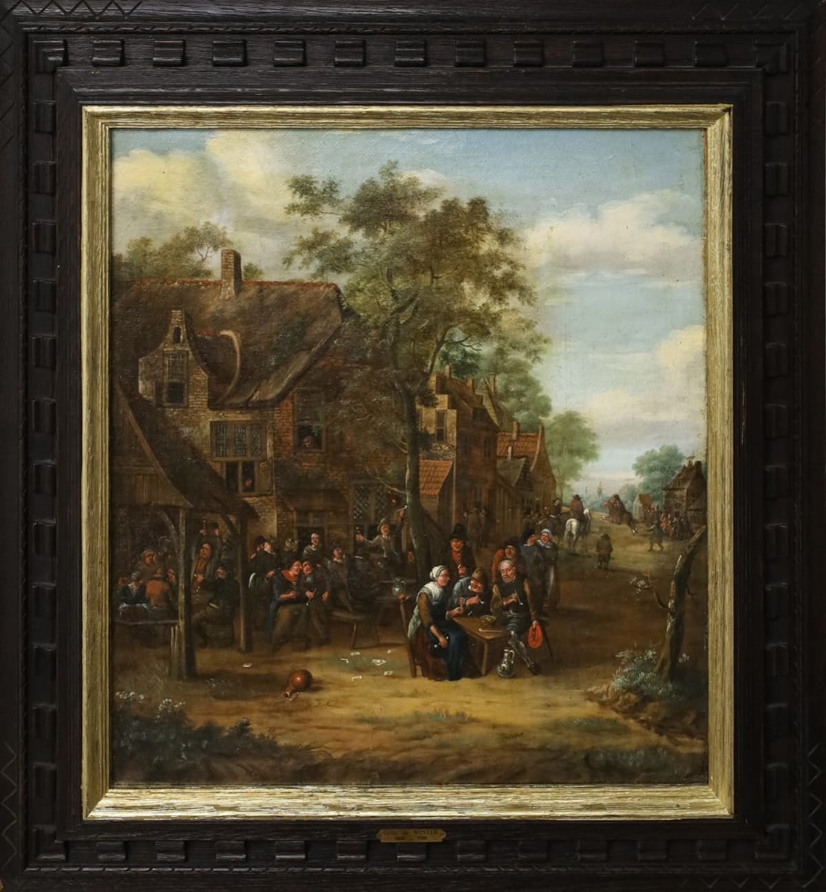 Gillis De Winter, Leeuwarden 1650 - Amsterdam 1720, ebbe la sua formazione nella bottega di Richard Brakenburgh. Introdusse variazioni negli schemi compositivi del maestro e dipinse analoghe scene di genere e di locanda, che possiedono un loro specifico colorito e nell'insieme appaiono più persuasive di opere paragonabili al Brakenburgh. La nostra opera è autografa, firmata in basso, e raffigura villici riuniti all'aperto, descritti con una puntigliosa precisione.