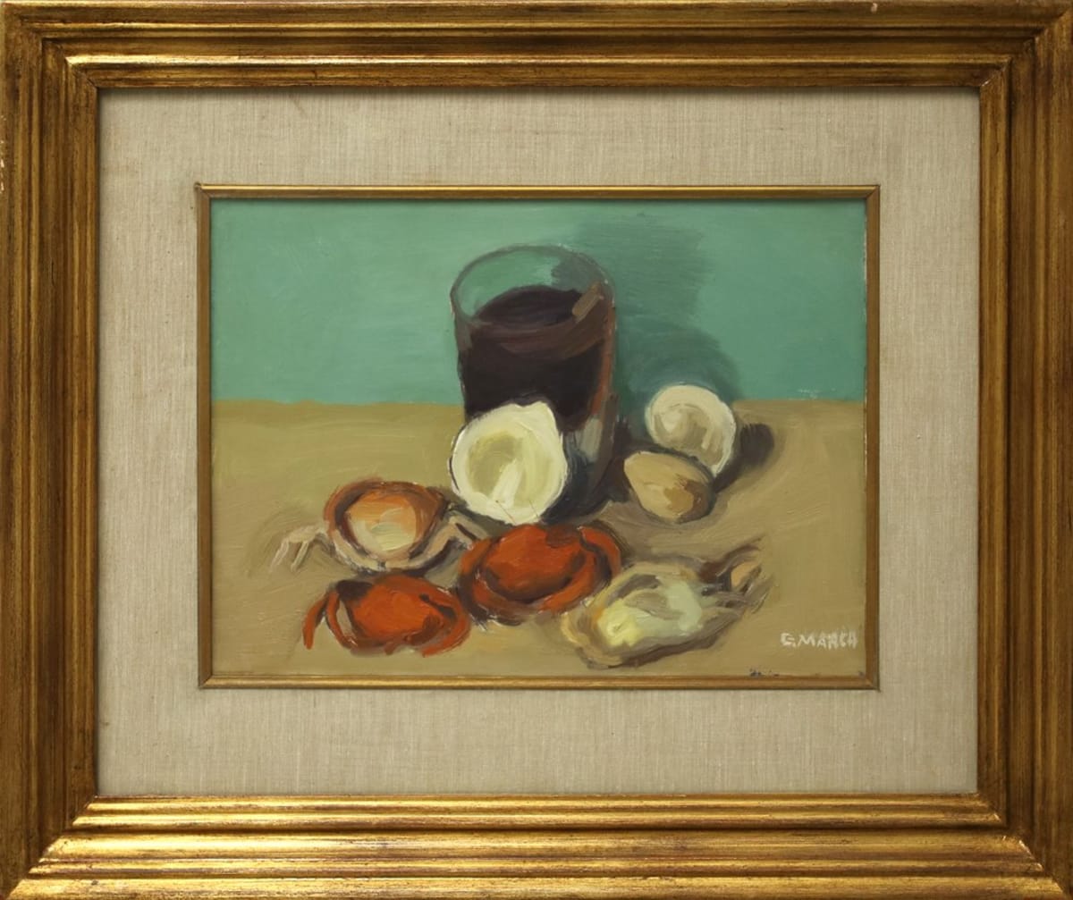 Firma in basso a destra; a retro firma e data Interessante lavoro di Giovanni March, artista livornese che, a partire dal 1915, cominciò a dipingere marine. Fu vicino a Ludovico Tommasi, e negli anni Venti fu protagonista di una serie di mostre che gli dettero celebrità e che stilisticamente lo avvicinarono a Mario Puccini. Fu tra i fondatori del Gruppo Labronico, presenziò anche alla IX Quadriennale di Roma del 1966. Verso la fine del suo percorso si dedicò alla natura morta con bottiglie.