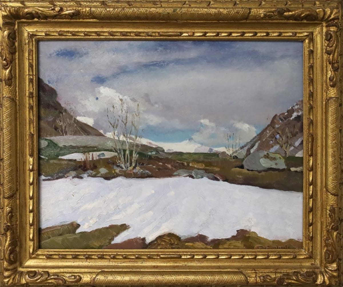 Firma in basso a destra; a retro etichetta Galleria Fogliato Sobrile si formò presso l'Albertina di Torino, con Grosso e Gilardi. Fu uno specialista del paesaggio, esordendo nel 1902 e specializzandosi soprattutto nei paesaggi innevati.