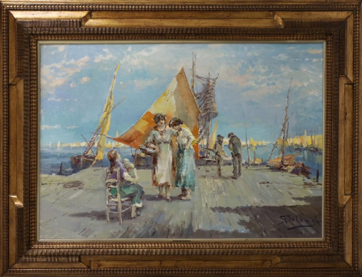 Firma in basso a destra; titolo sul telaio Interessante coppia di opere di Giuseppe Solenghi, artista formatosi a Brera con Tallone e Mentessi. Lavorò ad olio, pastello e acquarello, specializzandosi nel paesaggio e nella veduta urbana, specie milanese. Nel 1922 fu presente all'Esposizione Nazionale d'arte a Brera. Splendida veduta chioggiotta di grandi dimensioni e straordinaria qualità.