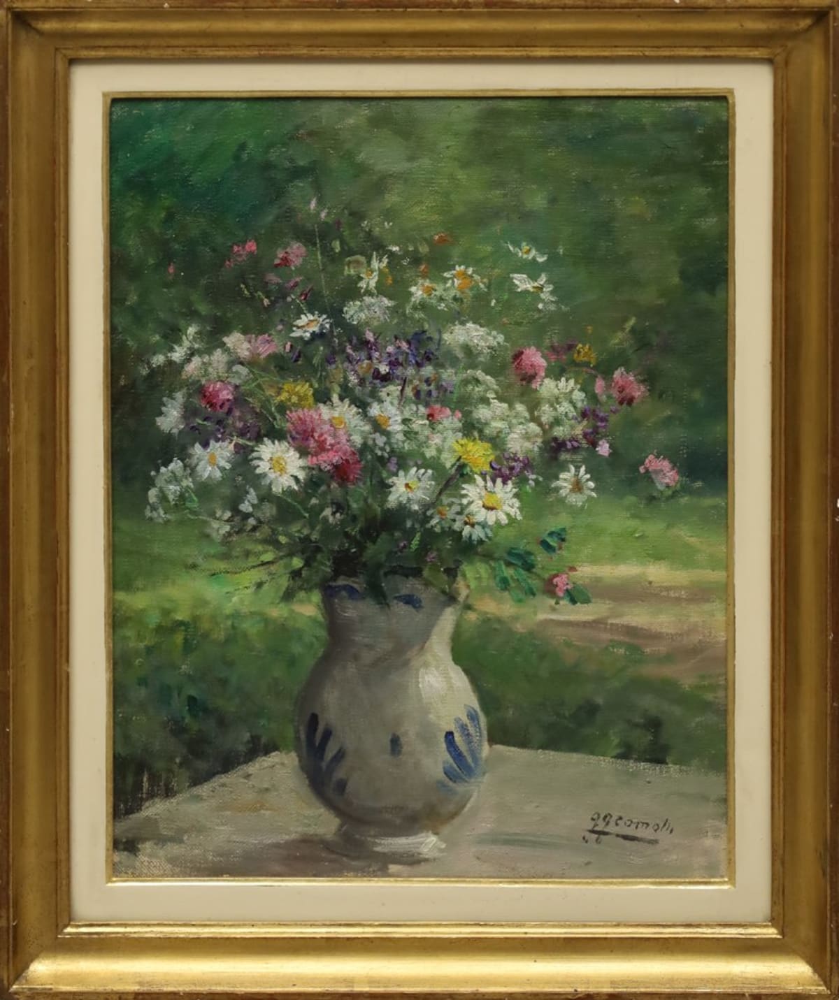 Firma in basso a destra Splendido dipinto di Comolli, raffigurante un vaso di fiori, tematica espressa più volte dall'artista milanese. Formatosi a Brera, fu essenzialmente un paesaggista, ma lavorò anche come pittore di natura morta. Espose alla Permanente e alla Biennale di Venezia, ed ordinò personali nelle Gallerie Dedalo, Ranzini, Scopinich e Salvetti.