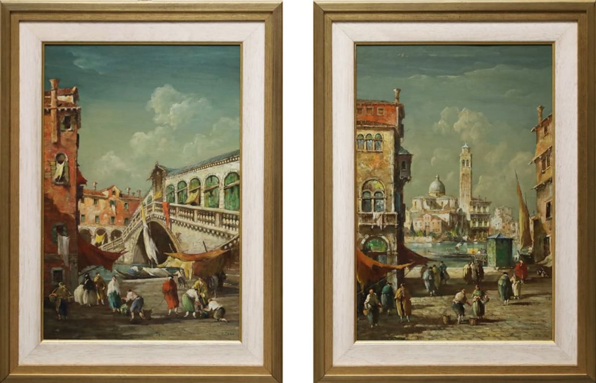 Opere entrambe firmate Allievo di Guglielmo Ciardi, si dedicò a cantare la laguna e Venezia in tutte le sue sfaccettature, come si evince dalla bella coppia di opere in esame. Espose molto, e sue opere si trovano nei Musei principali di Venezia, Milano, Genova e Lima