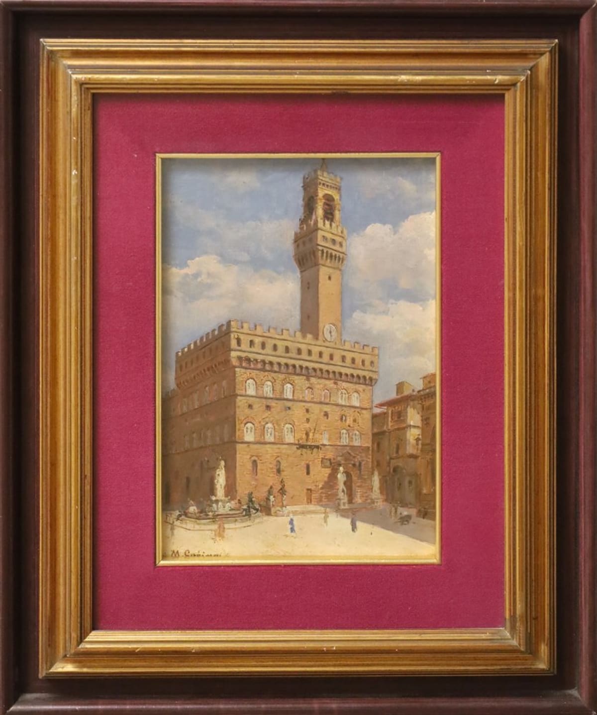 Firma in basso a sinistra Splendida veduta di Firenze di Michele Garinei, figlio d'arte e formatosi all'Accademia di Belle Arti di Firenze, in seguito vicino a Giovanni Fattori. Lavorò come frescante, come pittore di genere, paesaggista e ritrattista, prendendo parte a numerose esposizioni a Firenze, Roma, Milano e Torino. Il dipinto fa parte di una serie di opere dedicate a Firenze del Garinei.