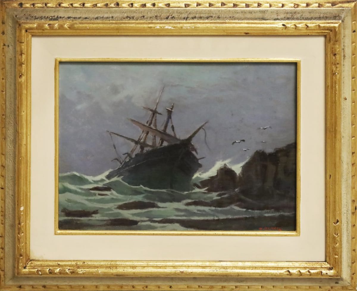 Firma in basso a destra Bel dipinto di Renucci, allievo di Manaresi, che si occupò di paesaggi e di episodi tratti dalla vita marina, come porti, velieri, scene di pesca. La nostra opera raffigura un veliero in difficoltà di grande raffinatezza tecnica e cromatica.