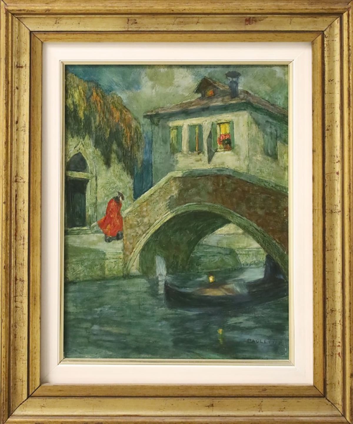Firma in basso a destra Paoletti, inizialmente allievo di Ciardi e Fragiacomo, si specializzò poi nei notturni veneziani di forte matericità, di cui il nostro dipinto è esempio fulgido. Espose varie volte alla Biennale, e dopo il trasferimento a Milano dette ampio spazio all'attività di illustratore.