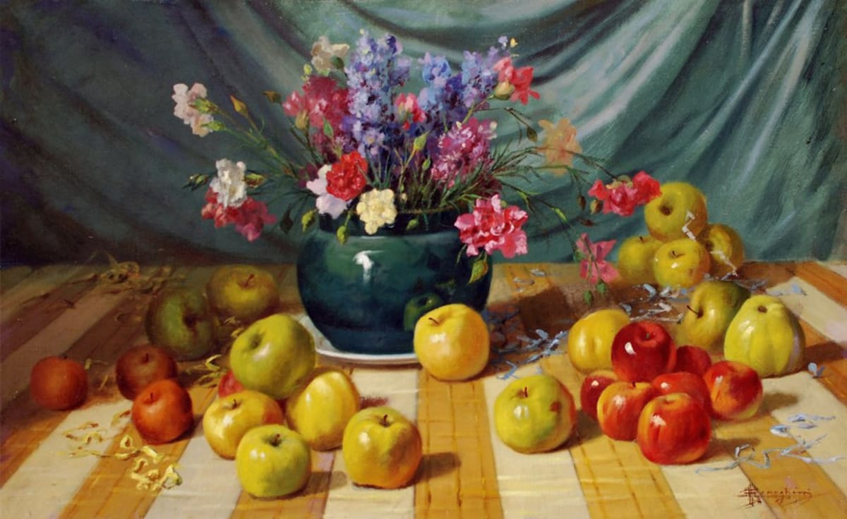 Firma in basso a destra Splendida composizione di Ruggero Meneghini, artista milanese specializzato nella natura morta e nel paesaggio. Opera corredata di splendida cornice d'epoca, siamo nei primi del Novecento. Fiori, frutta tra le sue scelte tematiche preferite.