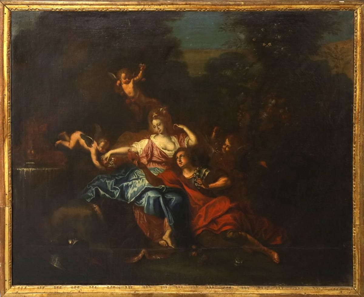 L'episodio di Rinaldo e Armida è un soggetto che ha ispirato numerose opere musicali e artistiche. Prende spunto dal capolavoro di Torquato Tasso, il poema Gerusalemme liberata pubblicato nel 1581. In esso l'eroe cristiano Rinaldo è attratto da Armida ma viene poi richiamato dal dovere della crociata. L'opera è un rilevante esempio della pittura bolognese vicino a Marcantonio Franceschini, Bologna, 1648 - 1729, e si rivela realizzata durante i primi anni del XVIII secolo, quando la sensibilità classicista dell'autore giunge a livelli raffinatissimi, senza dimenticare quegli elementi lessicali desunti dalla cultura primo seicentesca di Domenichino e Francesco Albani.