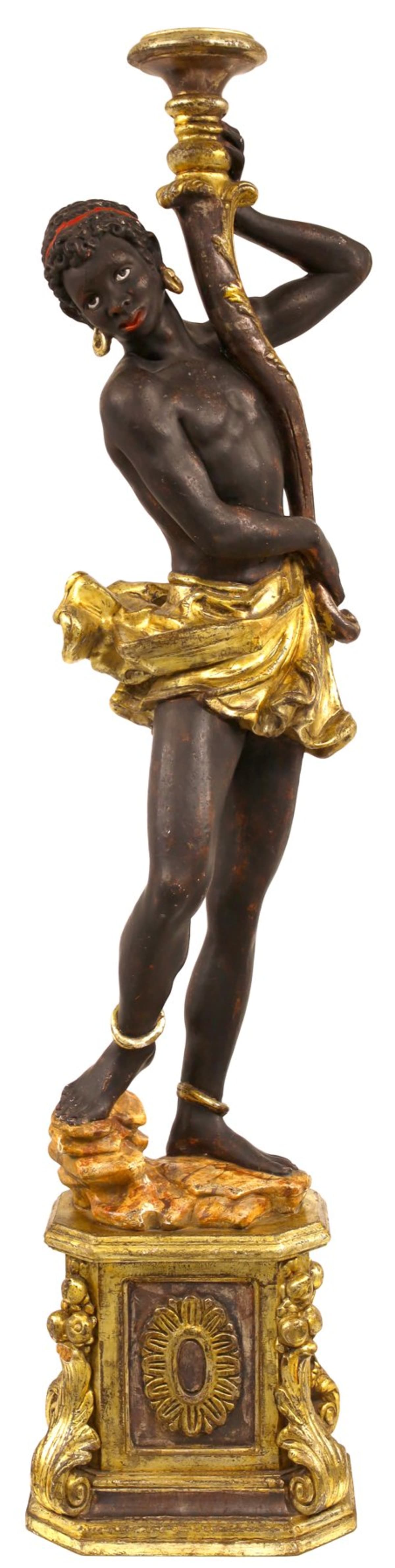 Scultura in legno policromo, laccato e dorato, raffigurante un Moro portacero in posizione stante colto mentre sorregge una cornucopia. Il Moretto è sorretto da una base a simulare delle rocce che a loro volta poggiano su di plinto ornato da decori fogliati. Emblema del potere della Serenissima e status di benessere, ricchezza e potere atto a celebrare la supremazia della Repubblica sui mari del Mediterraneo, la figura del Moro diventa il principale decoro per le sale da ballo degli sfarzosi saloni della Serenissima.