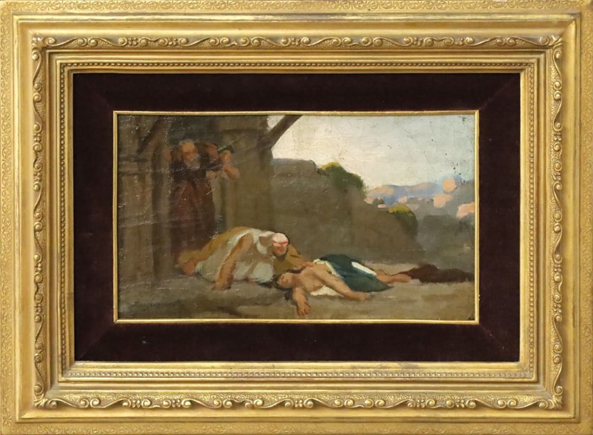 Firma in basso a sinistra Bel dipinto di Stefano Ussi, artista fiorentino formatosi presso la locale Accademia specializzandosi con Pollastrini nella pittura di storia, genere per cui fu famosissimo. Fu a Roma nel 1854 grazie ad un Pensionato, poi frequentò il Caffè Michelangelo, dove fu criticato dai macchiaioli per la sua poca adesione allo studio dal vero. Nel 1875 compì un importante viaggiò in Marocco, che, invece, lo avvicinò alla pratica macchiaiola. Fu ottimo ritrattista. Sue opere presso la Galleria d'Arte Moderna di Firenze.