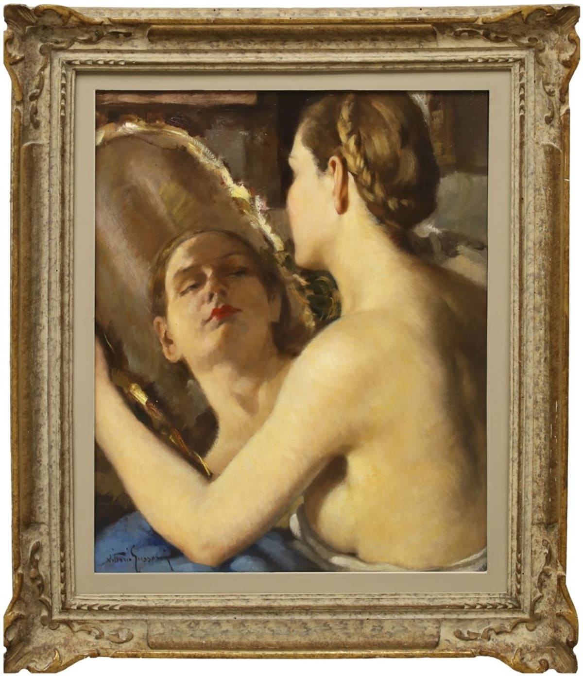 Firma in basso a sinistra Capolavoro di Gussoni, artista formatosi a Brera con Tallone e Alciati. Esordì nel 1922, vicino anche ai richiami di Novecento, e fu un pittore completo, dal tratto riconoscibile. Realizzò paesaggi, nature morte ma, soprattutto quadri di figura, specie femminili per cui raggiunge le cifre più alte.